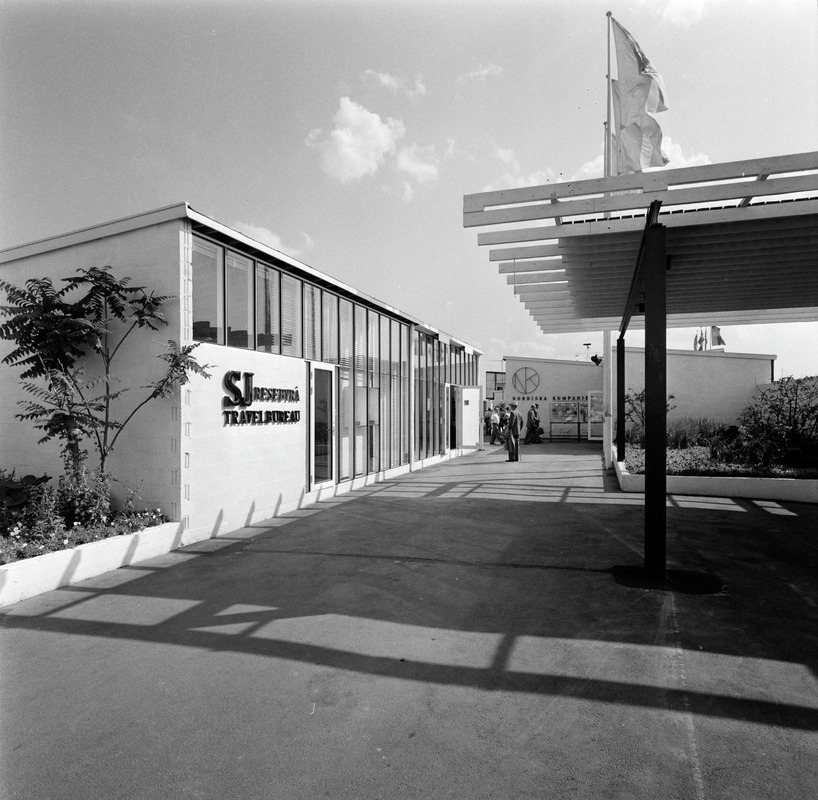 Bilden föreställer till vänster en paviljong med text på fasaden SJ xxxx. Mitt i bild ett litet torg med en form av överbyggnad med glesa reglar.