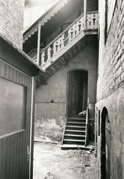 Fotografiet visar en gårdsinteriör på Södra Storgatan 33. På bilden syns en del av gårdshuset med murade väggar med inslag av korsvirke. Till höger intill byggnaden syns en trätrappa mot gårdsplan. En annan trätrappa löper under första trappan mot gårdens plan.