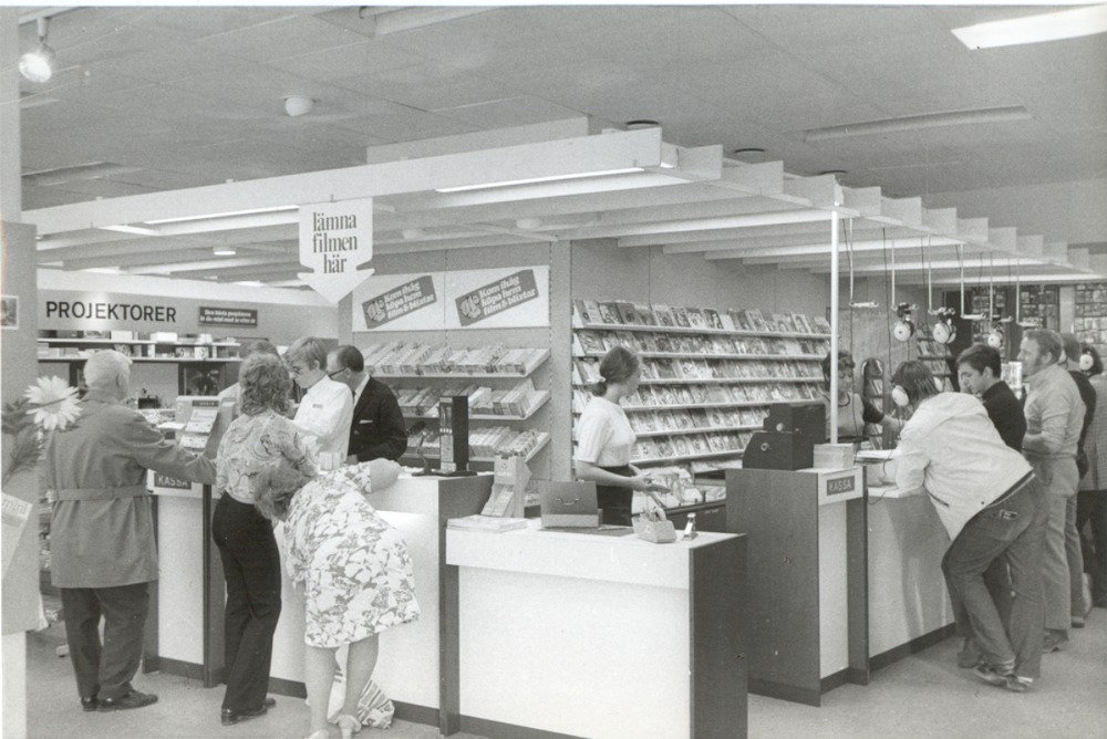 Fotografi som avbildar insidan av Hefomas affär på Stortorget 16, här ser vid kassan till vänster och till höger grammofon avdelningen där man kan lyssna på musik. Bilden är tagen på 1970-talet.