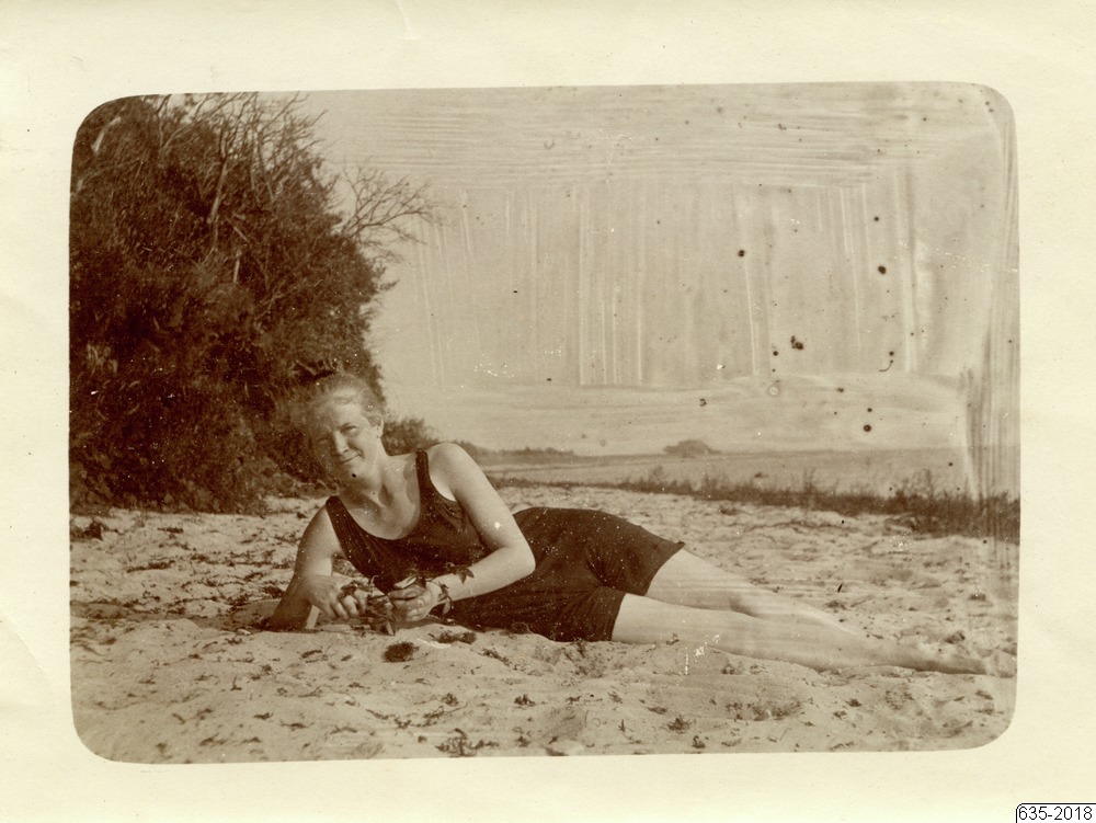 Bilden föreställer en kvinna liggandes i sanden på en strand iklädd baddräkt. I bakgrunden till vänster buskar och till höger hav.