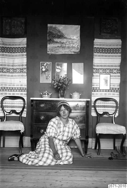 Konstnären Elin Lundh sitter på golvet framför en byrå
