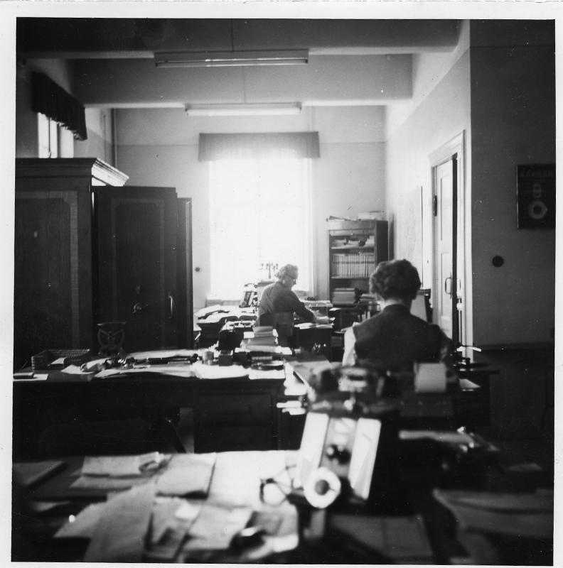 Svartvitt fotografi föreställande en kontorsmiljö. I rummet syns flera skrivbord med papper och skrivdon på. Två kvinnor sitter vid varsitt bord, de skriver på skrivmaskin. Bilden är troligen tagen på Cykelfabriken Kärnans kontor.