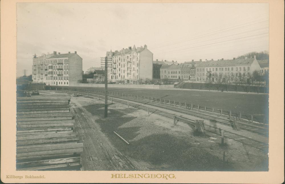 Det här fotografiet visar en vy över dåvarande Gröningen, några av husen på Drottninggatan norr om Hälsovägen och Karl Johansgatan, det dubbla järnvägsspåret som löper norrut längs med Gröningen och förbi husen på Karl Johansgatan. I fotots vänstra, nedre hörn ligger en hög slipers. Man ser två el/telestolpar utefter järnvägen med ledningar som löper mellan stolparna. Längs spåren finns staket på båda sidor. På andra sidan spåren finns ett fält (dåvarande Gröningen). På andra sidan fältet finns en gångväg med allé, som leder fram till en trappa som går upp till Drottninggatan. Mellan trappan och husen i bakgrunden, finns en plankomgärdad mindre trädplantering.