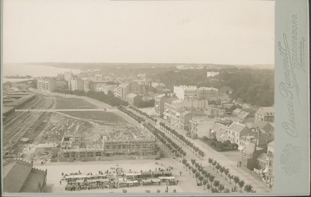 Fotot visar en vy över norra delen av centrum och norröver, en bra bit norr om Hittarp. Fotot är troligtvis taget uppifrån en byggnad precis söder om Sundstorget och ger en magnifik utsikt. I förgrunden ser man just Sundstorget med sina torgstånd och människorna och hästvagnar runt omkring. Nere i vänster hörn av fotot syns en del av taket på gamla Saluhallen. Precis norr om Sundstorget är det nya kvarteret Oscar ll under uppbyggnad och man ser ett flertal byggnadsarbetare runt och på bygget. Arbetsplatsen är kringgärdad av plank där man kan se reklam för olika verksamheter. Till höger i bilden (öster) om dessa platser löper Drottninggatan genom nästan hela fotot; från Sundstorget fram till korsningen med Hälsovägen - utmärkt med en allé i tre rader - och vidare nästan ändå bort till det Nya Kallbadhuset från efter1868 (då det första, byggt 1864, förstördes i en storm), precis nedanför Tågagatan. Längs med Drottninggatans, i bild, högra sida ser man dess bebyggelse. Till höger om den ser man den trädbevuxna Landborgen som sträcker sig bortåt mot fotots bakgrund. Mitt i Landborgens grönska lyser huset Vikingsberg vitt. Lite längre bort i bakgrunden ser man den dåvarande bebyggelsen på Tågaborg. Därefter börjar landet.