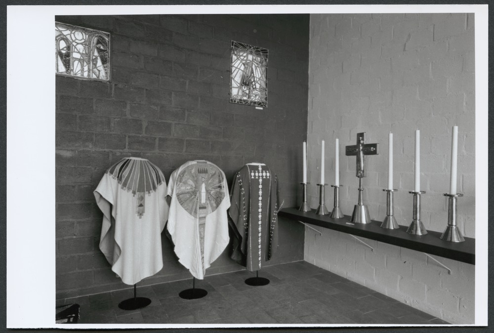 Bilden föreställer hallen för kyrklig konst eller sakral konst. En murad vägg med två glasmosaikfönster. Tre ställ med olika mässhakar. På en hylla på väggen till höger sex stycken ljusstakar med ljus samt ett kors på en likadan fot som ljusen.