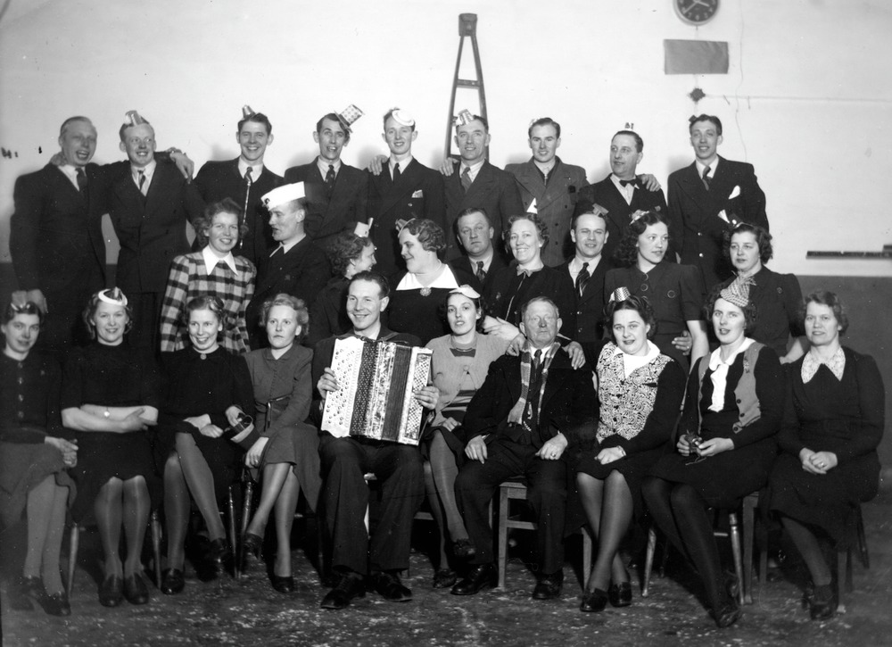 Gruppfotografi av personalen på Centralgaraget. Personalen har fest och de flesta är iklädda små, roliga hattar. En man spelar dragspel.