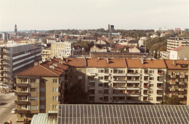 Utsikt från Gustav Adolfs kyrkan, mot norr med bland annat kv: Norge, i bakgrunden syns Rådhuset.