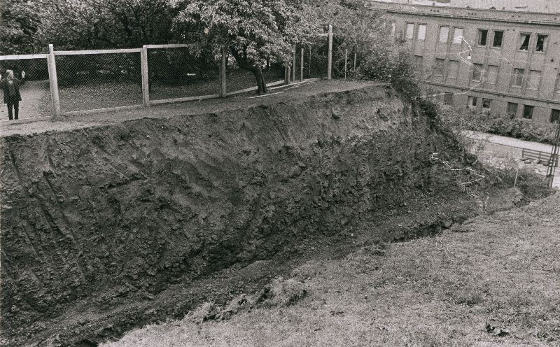 Bilden visar en schaktnings plats i öst-västlig riktning mot Bergaliden år 1971. På bilden syns spåren efter grävningsarbete. Gräv och byggplatsen är omringad av ett staket mot en park. Till höger syns en lång byggnad.