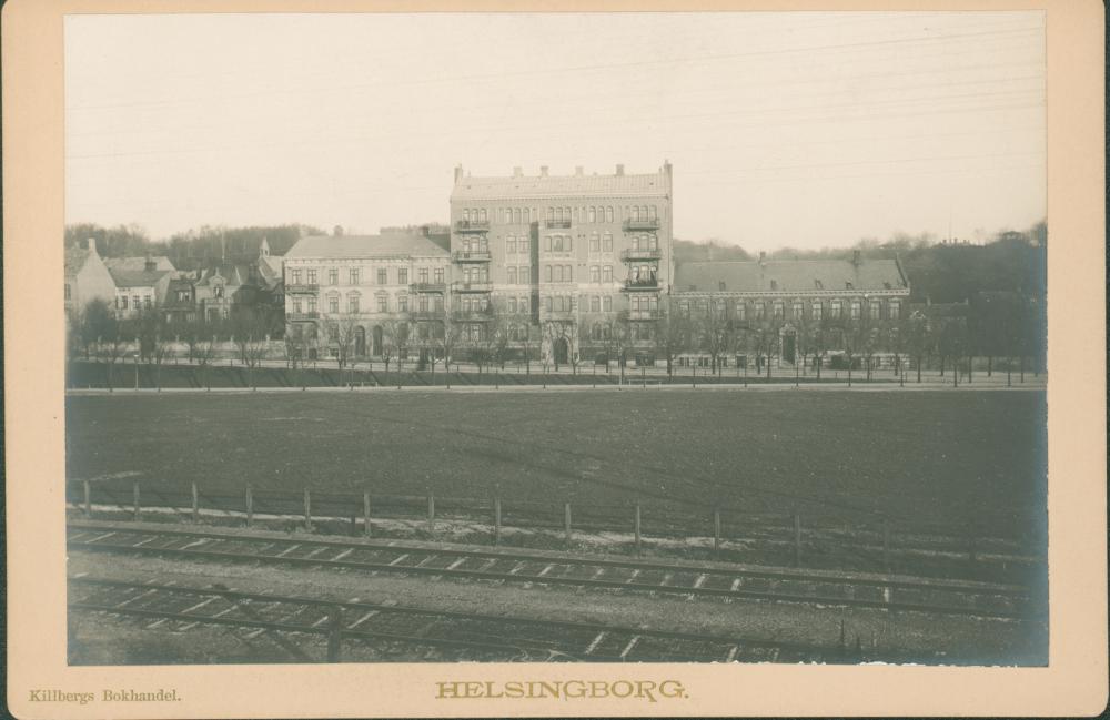 Fotografiet visar en vy över fältet, som var dåvarande Gröningen, framför Drottninggatan och dess sekelskifteshus, just där Drottinggatan och gångvägen, som leder till Karl Johansgatan, delar sig. Här delar sig också den treradiga allén, där den tvåradiga allén följer gångvägen och en enkelrad träd kantar Drottninggatan norrut. Träden är kala. Bakom husen skymtar landborgen, till stor del skogbevuxen. Till höger på fotot skymtar man två paviljonger uppe på landborgen. I förgrunden, på andra sidan fältet (sjösidan), ser man järnvägens dubbelspår med staket på ömse sidor. El/tele-trådarna anas i luften ovanför spåren.
