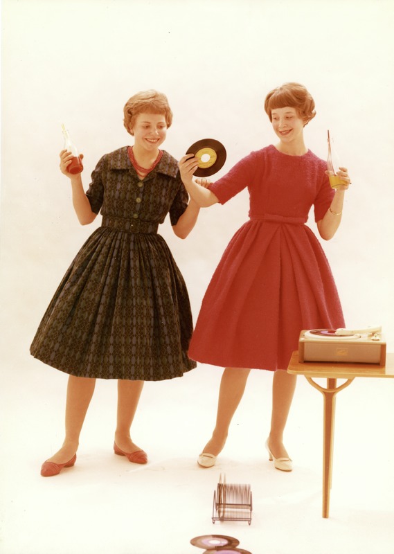 Två unga kvinnor poserar i klänningar från AB Margita konfektion. De håller varsin läsk i handen och Birgitta Palm (till höger) håller en grammofonskiva i handen. På ett bord står en grammofonspelare.