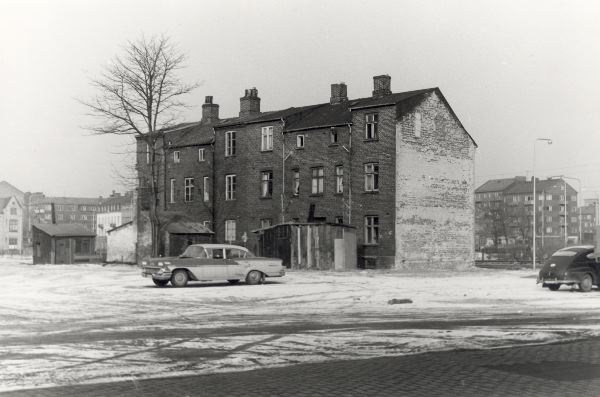 svartvitt fotografi föreställande gårdsplan med bilar och förrådsbyggnader. Kaserngatan 14-16, kvarter Argus. 1970.