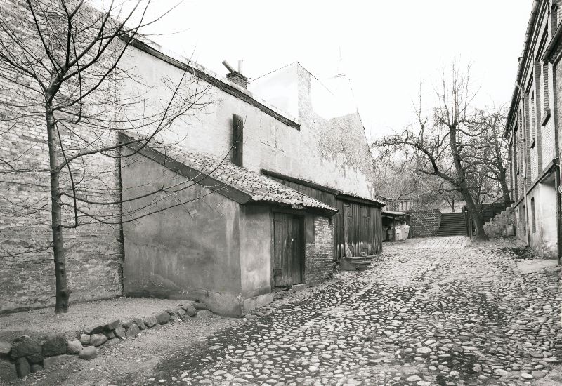 I bakgrunden syns trappor som går till en annan gårdsinteriör separerad med en stenmur.