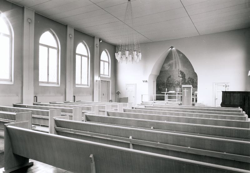 Bilden visar Baptistförsamlings kyrkointeriör mot altaret. På bilden syns altartavlan i form av en väggmålning, altarbordet och ett altarskåp. Bilden visar också rader med kyrkobänkar, fönster med arkader, dörrar, ett piano, vägglampor och i mitten av kyrkan en takkrona.