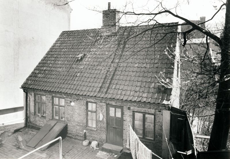 Bilden visar en del av en gårdsinteriör på Långvinkelsgatan 37, år 1971. På bilden syns ett hus med dörrar under ett fönster som är nedgången till källaren. I bakgrunden syns tornet Kärnan.