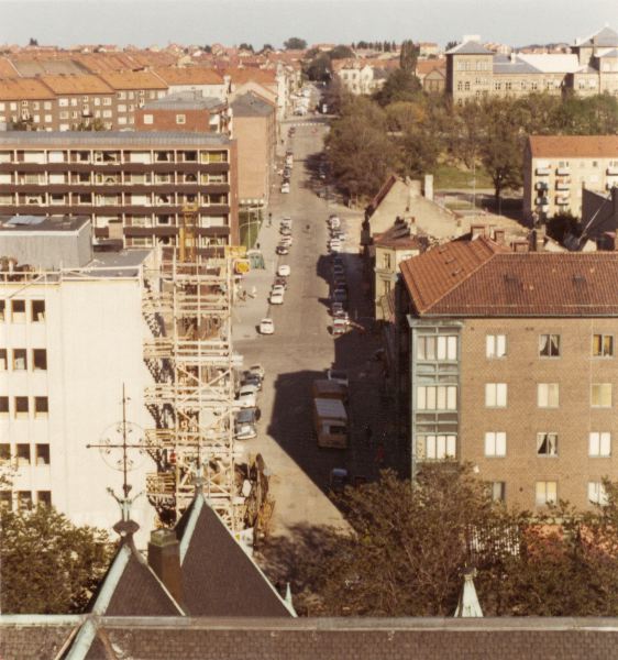 Utsikt från Gustav Adolfs kyrkan, mot öster, på denna bild syns Nytorgsgatan och en byggnadsställning.