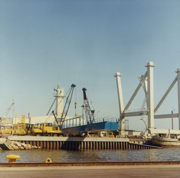 Första containerkranen monteras.