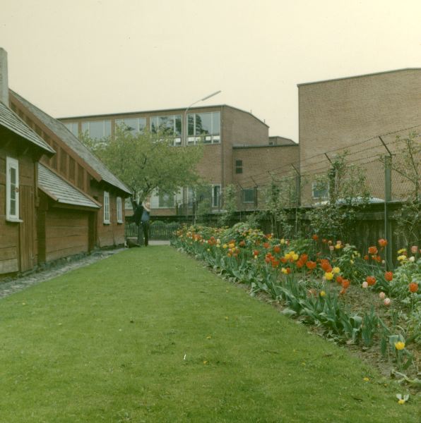 Fotografi på de vackra rabatterna på Möllebacken. Till vänster skymtar Holmagården.