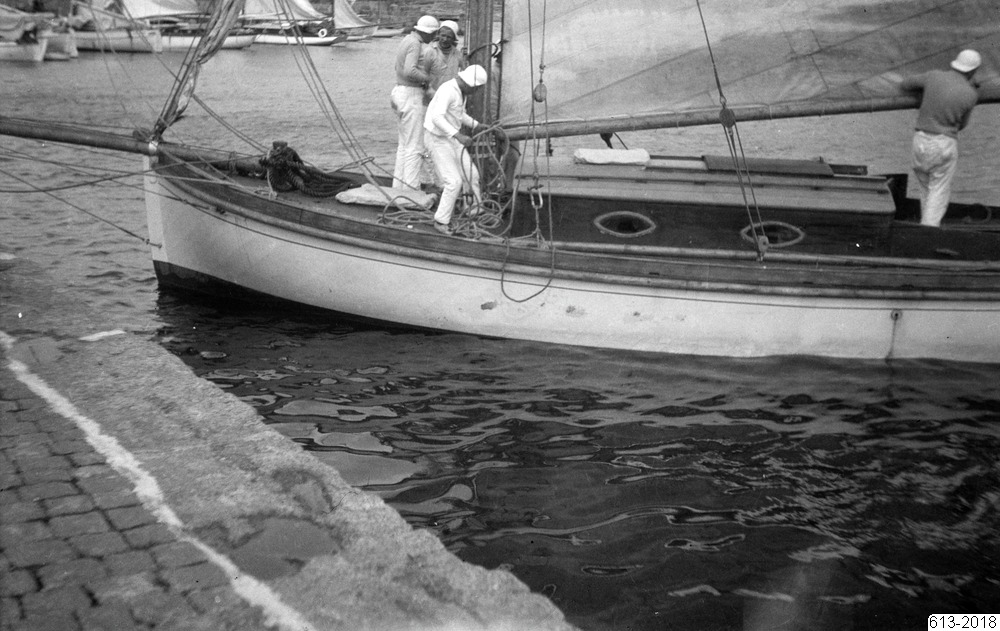 Bilden förställer en segelbåt med uppfällt segel, som rör sig i en hamn. På båten syns fyra personer.