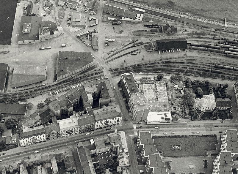 Flygbild över Drottninggatan, Tågagatan, järnvägen och hamnen.