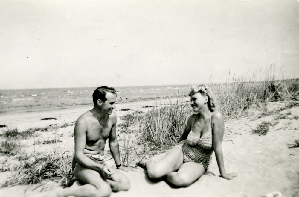 En man och en kvinna iklädda badkläder sitter på stranden vid Malens havsbad.