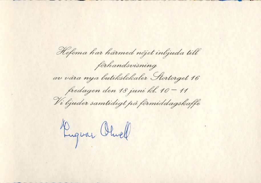Fotografi av en inbjudan till en visning av Hefomas nya lokaler på Stortorget 16. Signerad av Ingvar Ohnell. Troligen en inbjudan under år 1970 i samband med utflyttningen från affären på Järnvägsgatan 3.