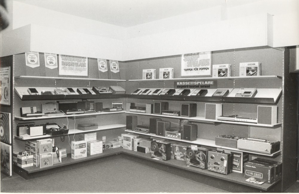 Fotografi som avbildar en kassett, band och grammofonspelar avdelning på antingen Hefomas affär på Stortorget 16 eller på filialen på Södergatan. Bilden är tagen på 1970-talet.