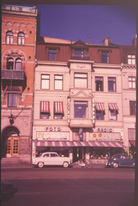 Färgfotografi som avbildar fastigheten som håller Hefomas butik på Järnvägsgatan 3. Daterad till 1970-09-04, men datering är osäker då det verkar fortfarande vara vänstertrafik. Se även DIG_2020_937 till och med DIG_2020_945.