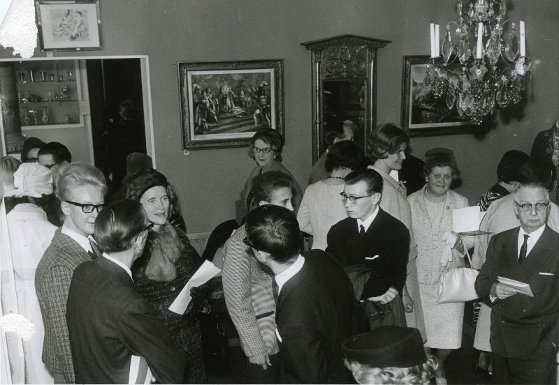 Fotografi av museiföreningens årsmöte och samtida utställning. Björn Engdahl och Margareta Hansson skymtas bland övriga besökare.