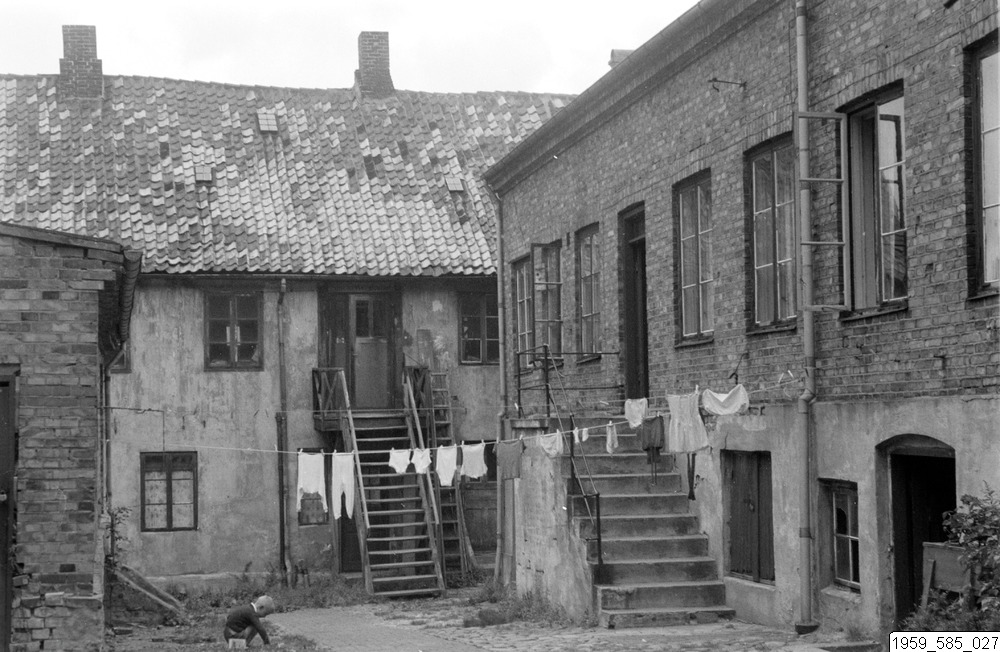 Bilden föreställer en stadsmiljö. I förgrunden en innergård. I bakgrunden två tvåplanshus i vinkel med trappor upp. Över gården hänger en lina med tvätt.