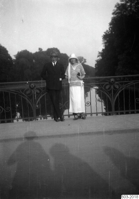 Bilden föreställer en kvinna och en man som lutar sig mot ett staket på en bro, träd i bakgrunden.
