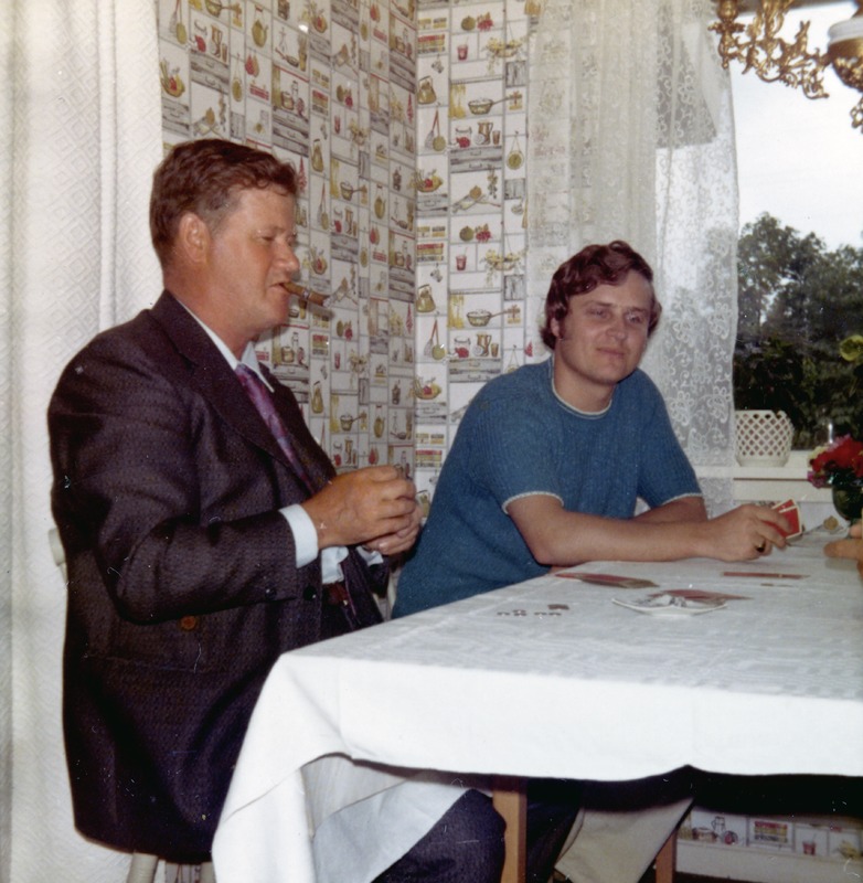 Grupporträtt av Lars Herder (till höger) med sonen Dick (till vänster) och Svea Rasmusson (mitten). Bilden är tagen i Öinge.