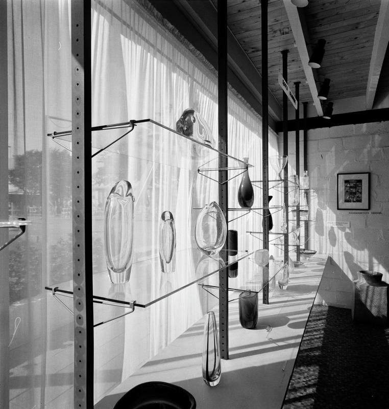 Bilden föreställer en vägg med drapperi framför. I sin tur framför glashyllor med prydnadsföremål och vaser. I taket strålkastare.