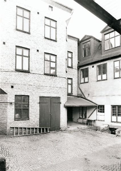 Bilden visar en gårdsinteriör och byggnader på Södra Storgatan 9. På bilden syns arkitektoniska detaljer såsom fönster, dörrbeslag, utetrappa mot ett förråd samt ett sol och regnskydd.
