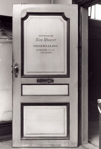 Bilden visar utsidan av en dörr till frisersalongen på Gamlegården på Norra Storgatan 9. Dörren är av ljus trä med mörka ramar, en dörrskylt och dörrvred med metallornament. På dörrens översta del syns en inskription med texten "Perukmakare, Thor Winett, Affärstid ½ 9- 6, Tel.13896."