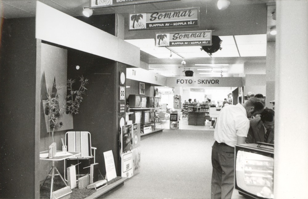 Fotografi som avbildar insidan av Hefomas affär på Stortorget 16, här tv avdelningen med foto och skiv avdelningen i bakgrunden. Bilden är tagen på 1970-talet.
