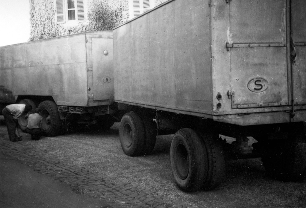 Bild på bakre de av lastbil samt släp. Två män kikar på ett av däcken.