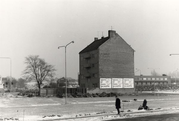 svartvitt fotografi föreställande bostadshus med Domus-annonsering (med texten "spänsta nu! Domus har grejerna"). Tegelbruksgatan 35, kvarter Finland. År 1970.