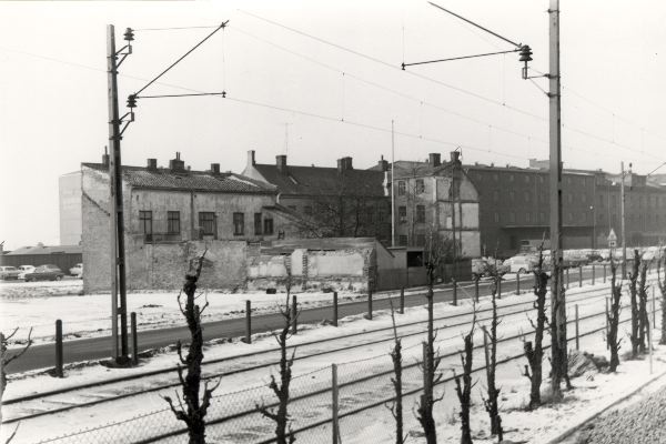 svartvitt fotografi föreställande järnvägsspår vid Kaserngatan 6, kvarter Argus. År 1970.