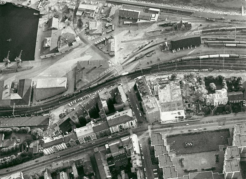 Flygbild över Norra hamnen, järnvägen och Drottninggatan. På fotot står skrivet med tusch: "Fredag 4 juni kl 19.35-19.38"