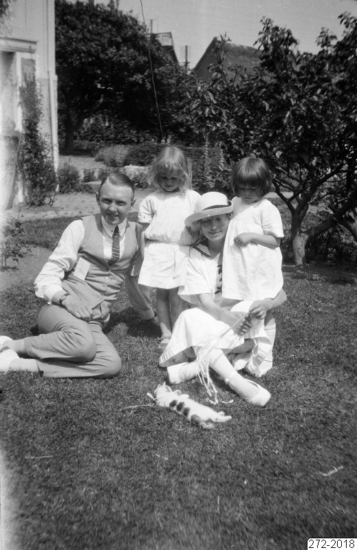 Bilden föreställer två små flickor i klänning ståendes på en gräsmattavid en sittande kvinna och en sittande man, eventuellt ligger en kattunge på marken. I bakgrunden träd och en hörna av ett hus.