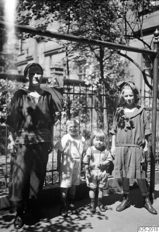 Bilden föreställer en kvinna och tre barn stående vid ett högt staket av metallnät. Träd och fasad i bakgrunden.