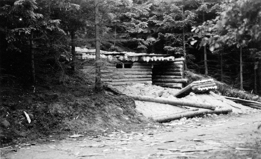 Bilden visar ett enkel byggnad av kluvna stockar som byggts i en skog.
