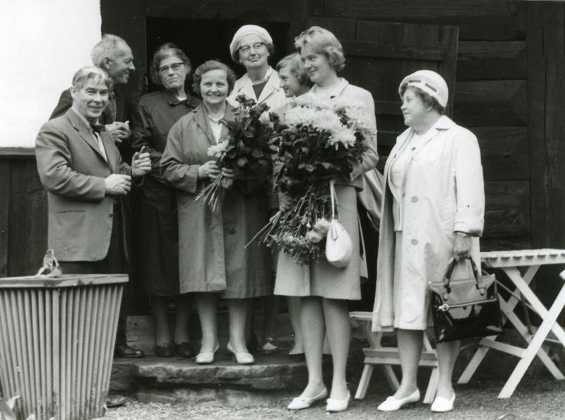 Fotografi av Ingeborg Löfbergs avtackning som ägde rum i klockarestugan. Från vänster Otto Holmström, Knut Svensson, Anna Andersson, Ingeborg Löfberg, Elsa Jarlman, Urve Lepason, Margareta Hansson och Ester Andersson.
