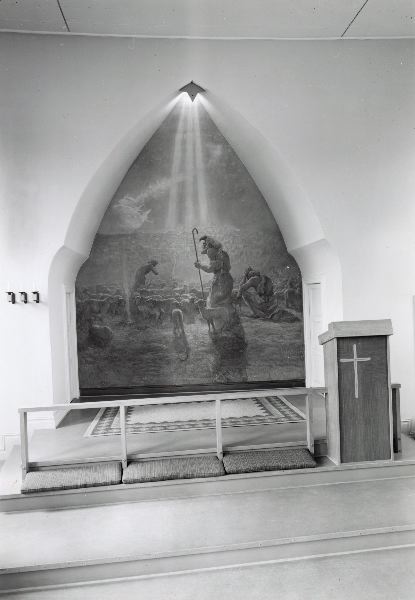 Bilden visar en kyrkointeriör utan altarbord från Baptistförsamlings kyrka, på Långvinkelsgatan 26, år 1971.