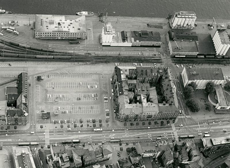 Flygbild över Norra hamnen med silosarna, Sundstorget, järnvägen och Drottninggatan. På fotot står skrivet med tusch: "--- kl 19.27-19.30"