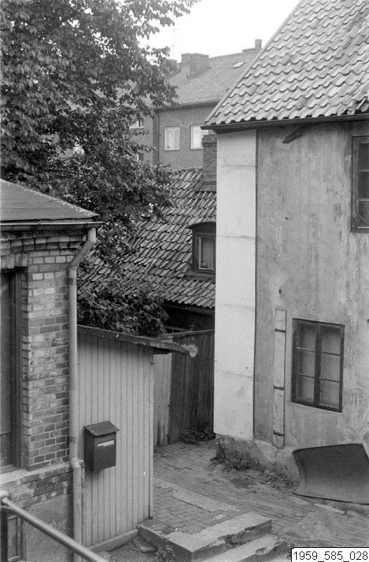 Bilden föreställer en stadsmiljö. I förgrunden en innergård omgiven av mindre delar av olika byggnader. På ett litet uthus hänger en brevlåda.