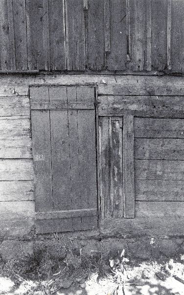 Bunkagården år 1971. Timrad stuga, sekundära öppningar i västväggen.