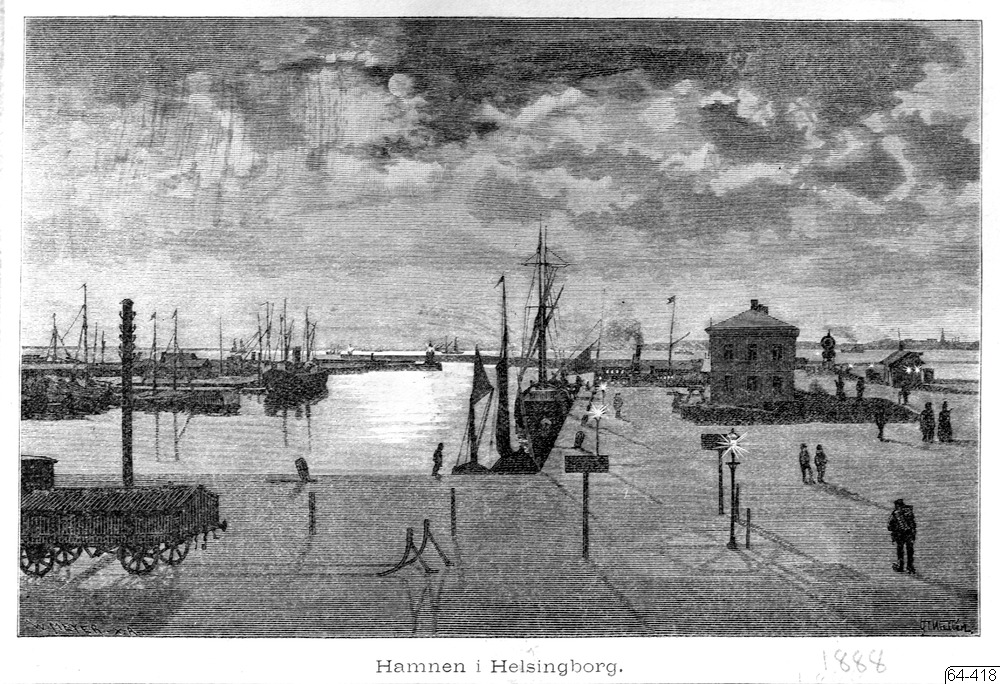 konstverk/stick som föreställer "Hamnen i Helsingborg" 1888