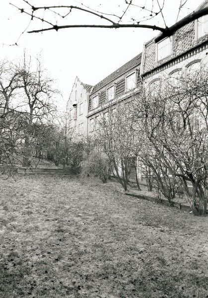 Bilden visar en del av Himmelsriksgränden år 1971. På bilden syns till höger flera byggnader med en liten balkong och mönsterbelagda väggar. Vid sidan om gränden syns en del av trädgården som ligger parallellt med bostäderna i lutande plan.