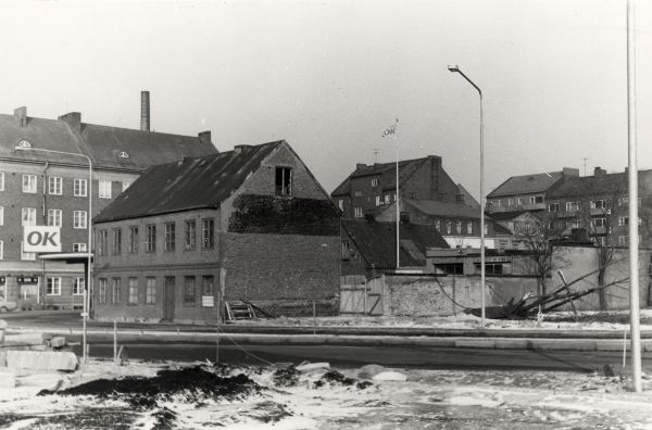 svartvitt fotografi föreställande bensinstation med bostadshus i bakrunden, Karl Krooksgatan 69, kvarter Finland år 1970.